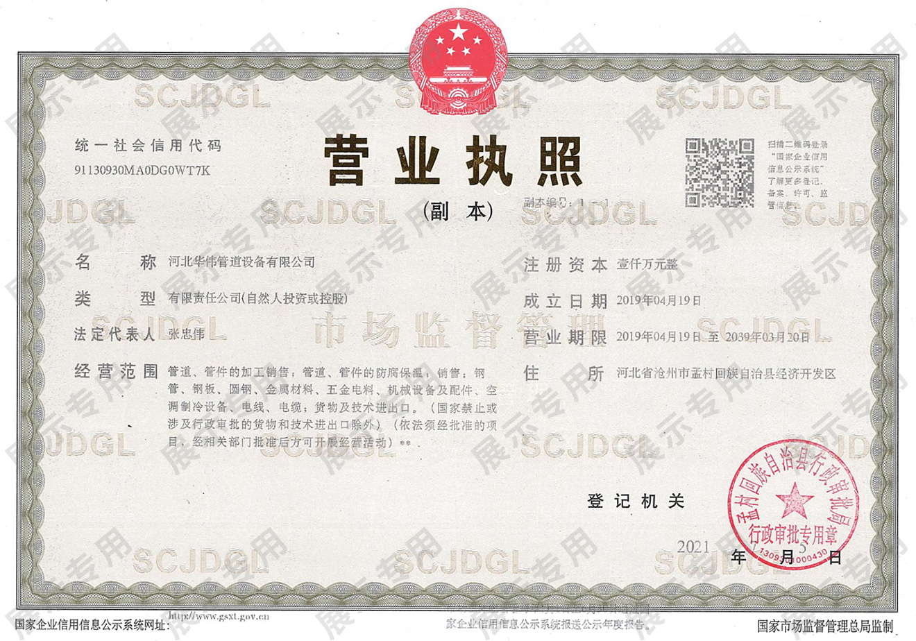 河北華偉管道設(shè)備有限公司將全力擴(kuò)展市場(chǎng)份額,爭(zhēng)取為國(guó)內(nèi)、國(guó)際重大項(xiàng)目的管道應(yīng)用提供更優(yōu)質(zhì)的產(chǎn)品,做出更大的貢獻(xiàn)。河北華偉管道設(shè)備有限公司以“質(zhì)量是生命,發(fā)展靠信譽(yù)”為宗旨,以優(yōu)質(zhì)的產(chǎn)品、合理的價(jià)格、良好的服務(wù),與國(guó)內(nèi)外新老用戶真誠(chéng)合作,共創(chuàng)美好未來(lái)!